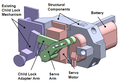 In order to prevent the door from opening, we retrofitted the lock of an existing door with a servo motor and a mechanism to actuate the child lock. This meant that we could disengage the door handle from the door latch, effectively preventing someone from opening the door even when they pull on the handle. We also incorporated a LED light to signal when there was an impending collision.The full system, removed from the door, can be seen in the title image.